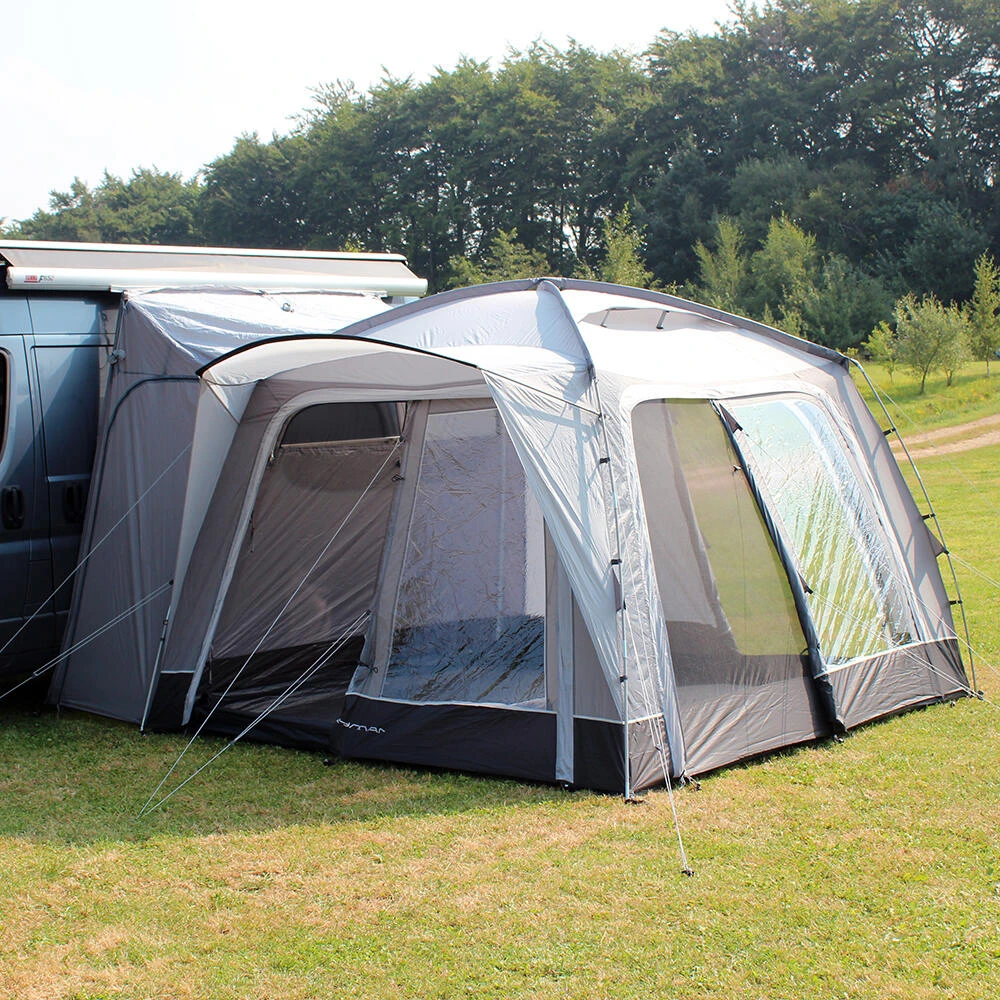 This lightweight pole and sleeve drive-away awning remains the most popular, upper entry-level small family weekender on the market. With just two fibreglass poles used to create the main body of the awning it is quick and easy to pitch, and structurally very stable. The unique design means this is one of the most versatile driveaways on the market, offering access from all sides of the awning through the large roll back doors. Has the option to zip a Cayman Bedroom Annex to the back of the awning, meaning your main living space is not affected if you are looking to add sleeping space. Available in Three ergonomic cowl heights to suit the vast majority of campervans & motorhomes, the Cayman F/G offers unrivalled value for money. Including a ‘fold-flat’ sewn-in groundsheet, and lots of ventilation with plenty of mesh fly screen panels, this is the awning of choice for smaller touring families, couples or independent adventurers, who crave more usable space alongside their van, to meet a budget. Fixing Height 180cm – 220cm (Low). • 120HDE high density all-weather lightweight fabric
