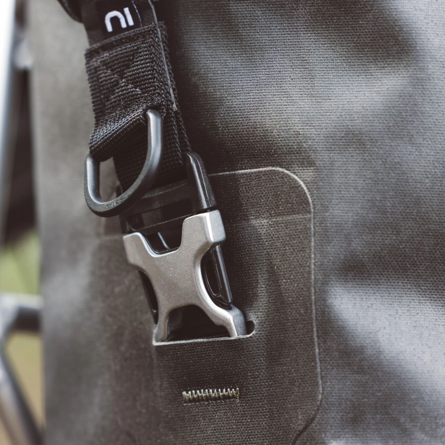 “One click” mounting system for clipping the bag to the pannier rack in just one motion.